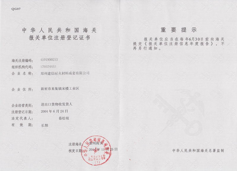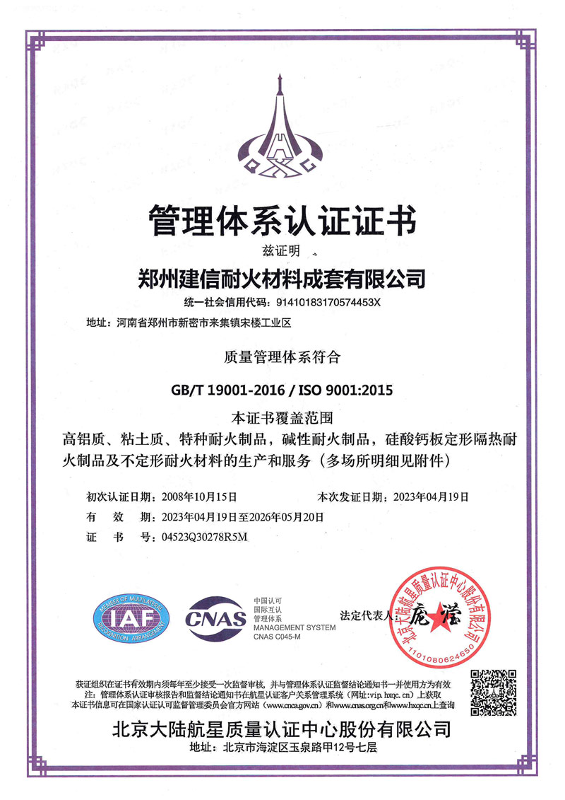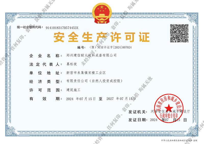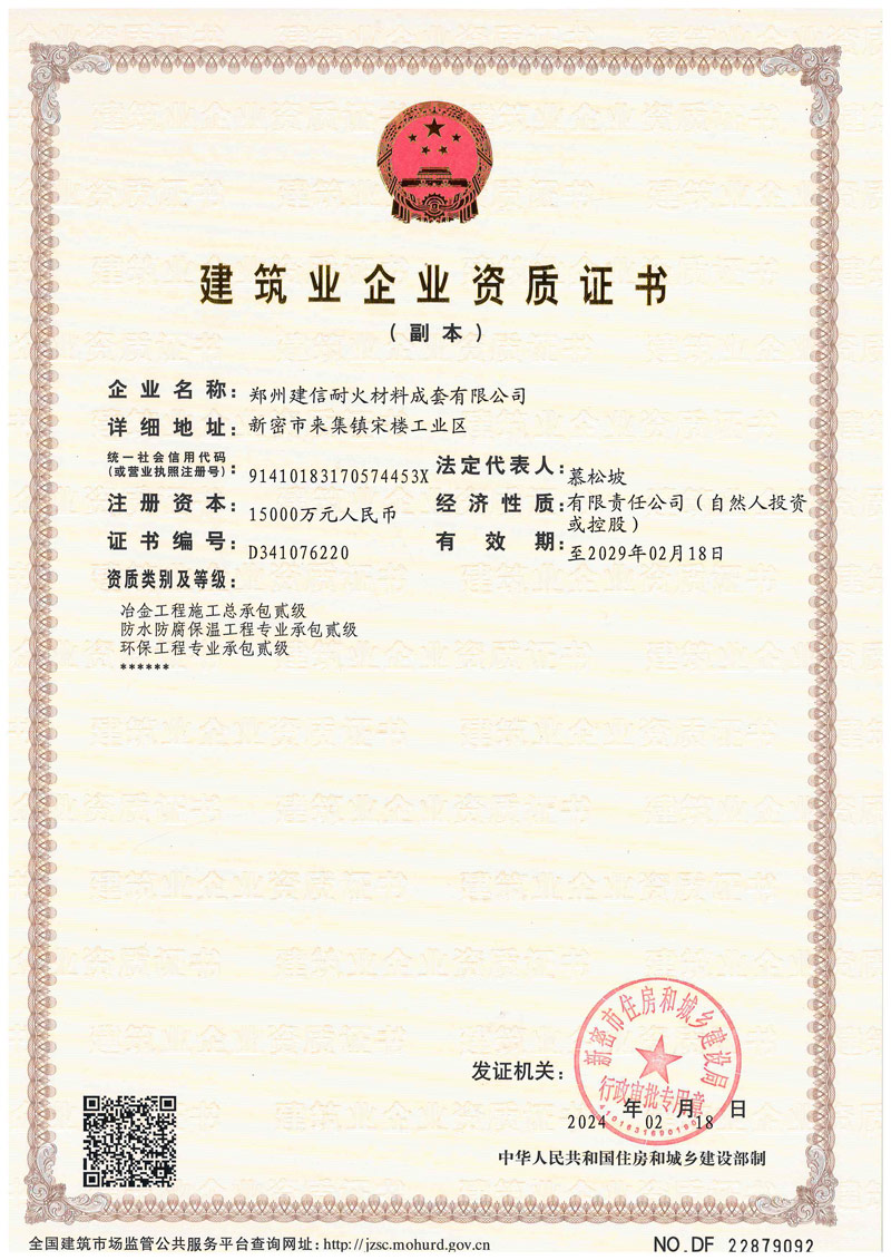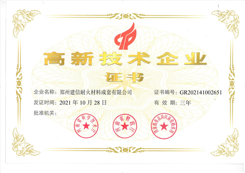 郑州建信耐材先后参与起草国家建材及行业标准:《高铝抗剥落砖、系列耐碱砖及系列硅莫砖》、《水泥回转窑协同处置用耐火材料抗侵蚀实验方法》、《耐火材料及砌筑使用规程》和《石灰窑砌筑技术条件》。公司近年来先后荣获“国家科技型企业”、“高新技术企业”、“河南省绿色工厂”“河南省绿色发展先进型企业”“环保绩效A级企业”、郑州市“专精特新企业”“市长质量奖”等殊荣。