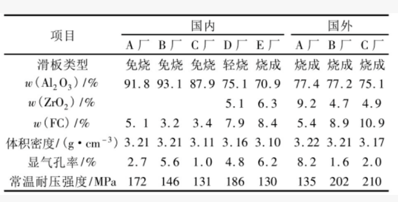 目前,国内外滑板材质仍然以铝碳质、铝锆碳质为主。另外,对于特殊钢的浇注,还使用镁碳质、镁尖晶石质、尖晶石碳质和锆质滑板。