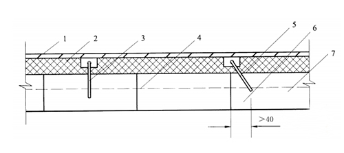 隔热耐火砖砌体的拉砖钩(或锚固钩)应位于隔热耐火砖的中间。当拉砖钩(或锚固钩)遇到砖缝或膨胀缝时,可水平转动拉砖钩(或锚固钩),其嵌入处与砖缝或膨胀缝间的距离不应小于40mm(图2)。