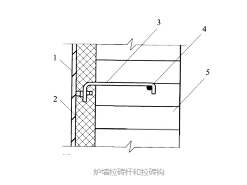 1-炉壳钢板;2-隔热层;3-拉砖钩;4-拉砖杆;5-耐火砖
