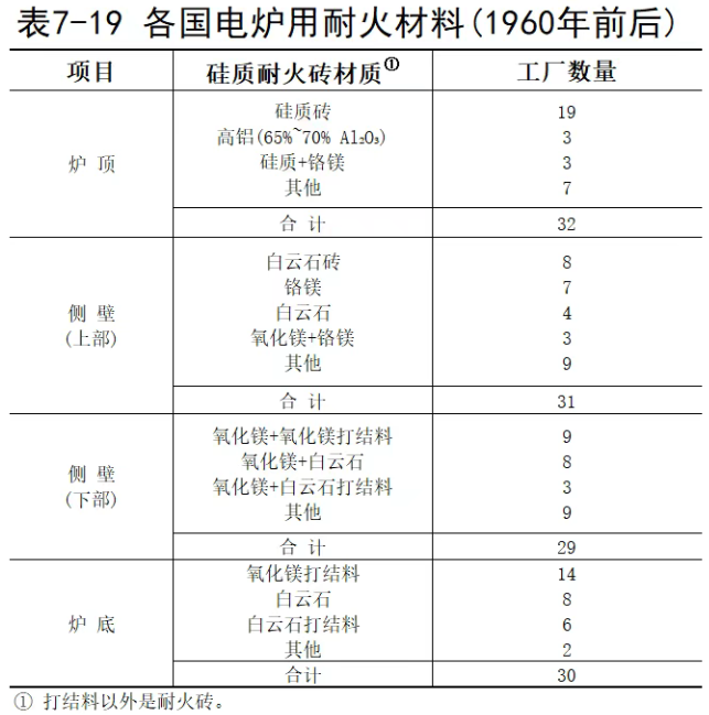 电炉与平炉同样,电炉的耐火材料也可以分为炉顶、侧壁以及炉底。1960年前后电炉耐火材料的使用状况,由〇.Porkert对世界8个国家的33家工厂的碱性大型电炉所进行的调查(表7-19)说明了这方面的情况,当时日本标准的使用形式是: